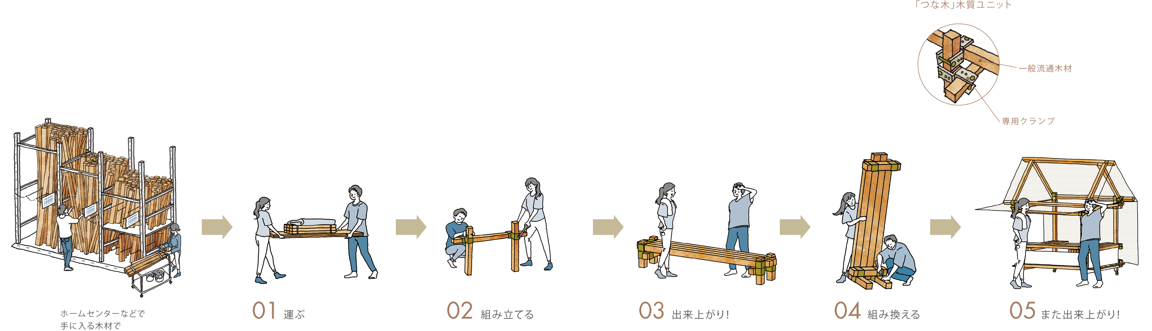 Nikken Wood Labでは、木材利用の裾野を広げるアクションとして「全国 どこでも だれでも」が組み立て、解体、移設できる木質ユニット「つな木」を発案しました。つな木は45mm角の一般流通木材と接合金物の組み合わせにより、家具から少し大きめの空間を人の手でつくることができ、同じ部材を組み換えることで様々な形や機能にトランスフォームできる点も特徴です。